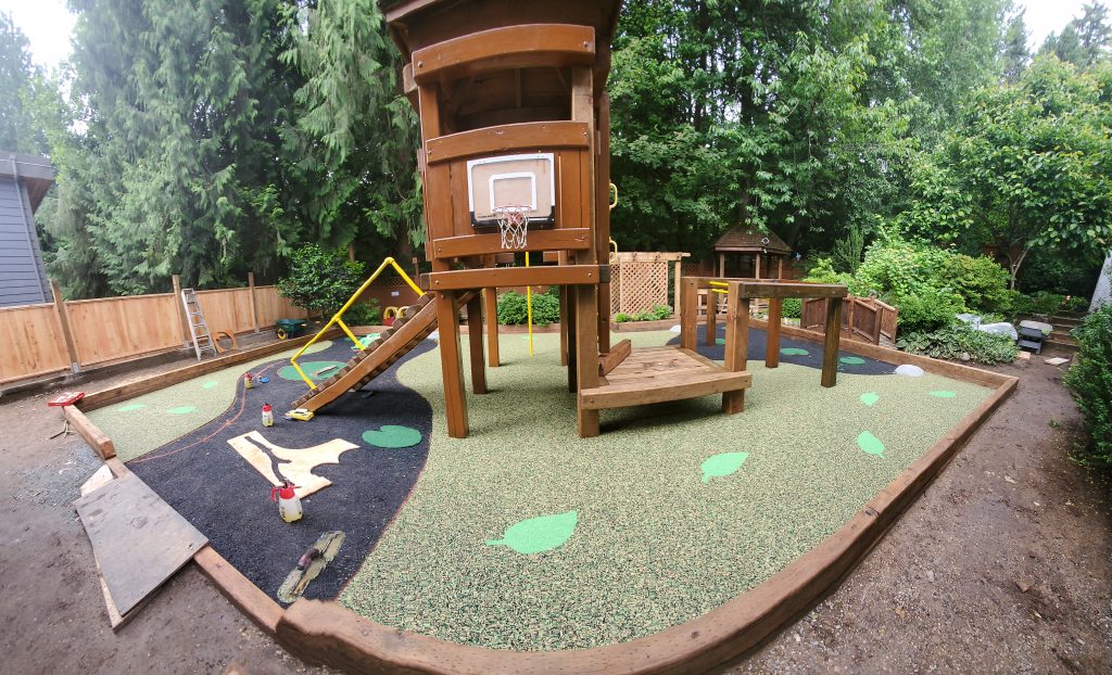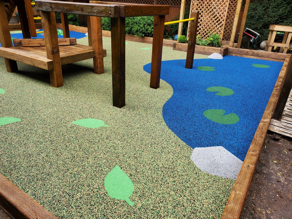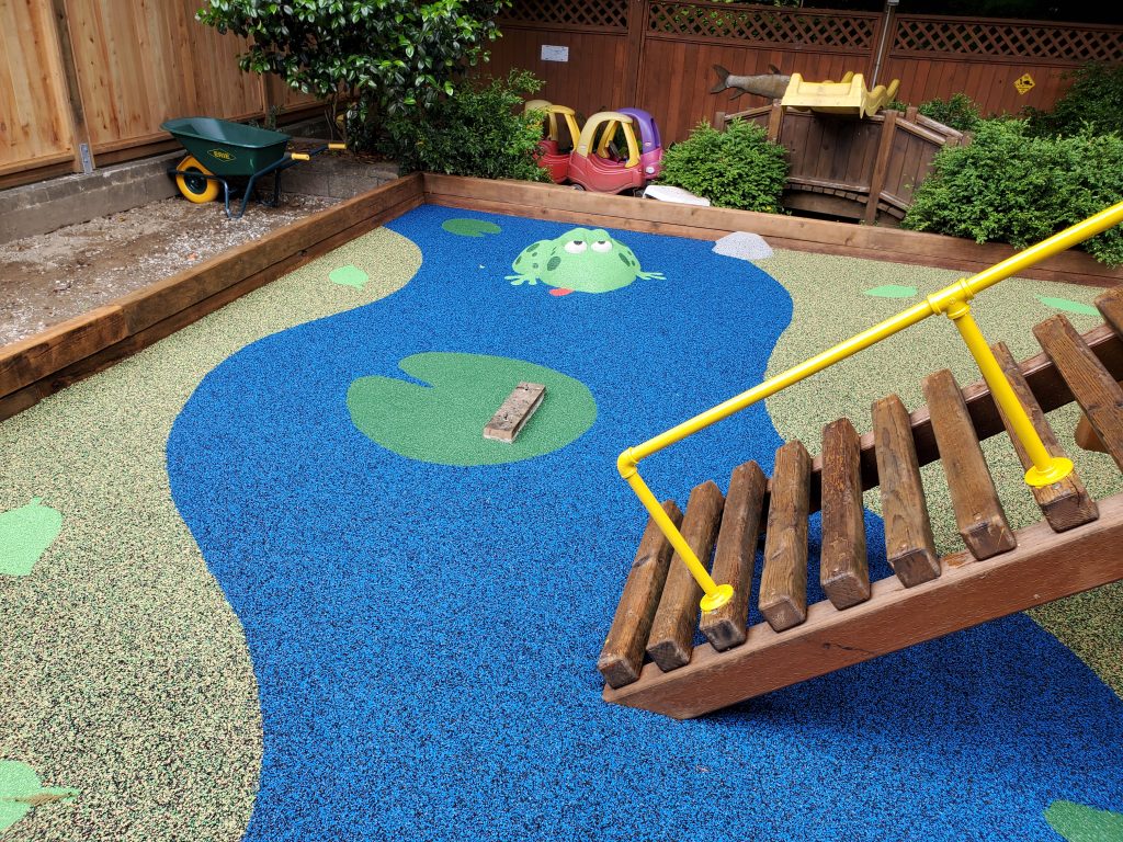 Preschoolers at Froggy Pad Daycare in North Vancouver are delighted with their new pour-in-place playground surface featuring a whimsical 3 dimensional frog and boulders to jump and sit on.